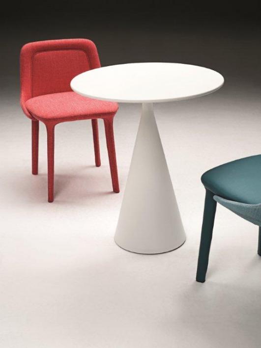 BISTROT by Luca Nichetto: The main concept, on which the project is developed, is to combine a compact aluminum conical base -to give the right space of movement- with a round, square or rectangular top with reduced size.