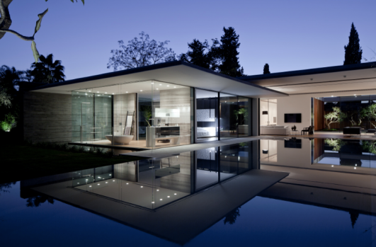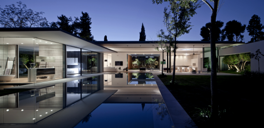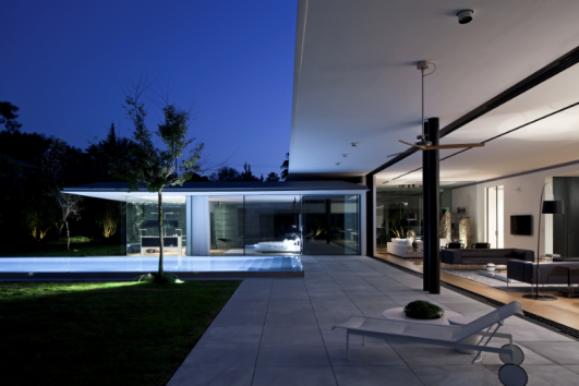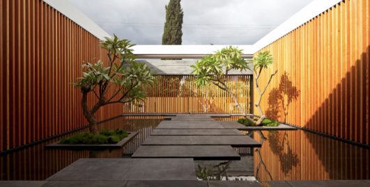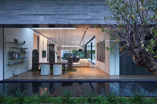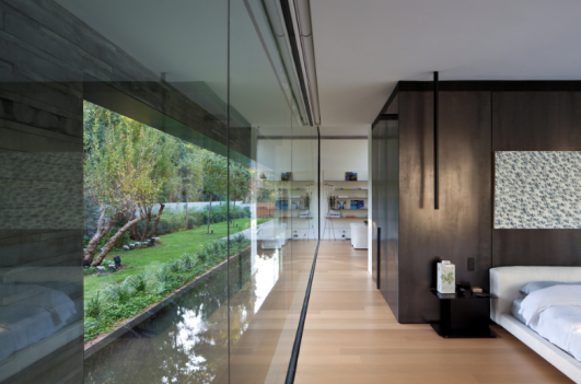 Whilst walking through the entrance lobby space, we cross a transparent pool, studded with large basalt rocks and trees that seem to float on the water. As we enter the entrance lobby, we experience the illusion that the house is floating and being reflected, just as the roof appears to be floating above the structures walls.