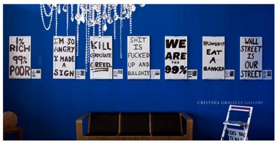 The artist wishes to support the 99% by inviting collectors (representing the 1%) to purchase the complaints as art or furniture, thus introducing the ideas of one group into the homes of another and at the same time, getting the rich to support the cause of the 99%.