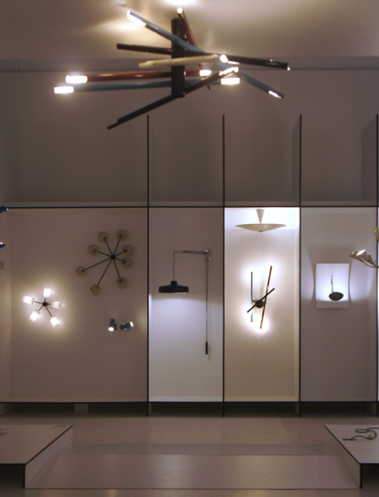 The pieces, more than 230, are presented in chronological order and divided by styles. The overview starts with the wall lamps, then moves to the reading lamps, floor lamps and ceiling lamps highlighting the relationships between light and space. Most of the lamps are turned on, giving the exhibition space a joyful and powerful aspect. A sophisticated and minimal graphic design project helps the visitors understanding the designer works and the curatorial project.