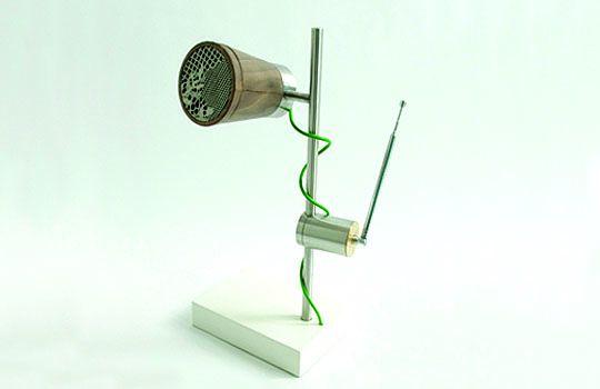 “Naked Radio nods to the experimental, homegrown roots of early crystal sets through a vertical assembly in which key components are freed from their usual cubic existence. Functions are controlled by the corresponding component: volume adjustment is made via the speaker, whilst tuning is altered via the aerial. The use of varied materials and textures is derived from the rich fittings used in the early 20th century, whilst stainless steel firmly places the radio in the audio family of objects.”