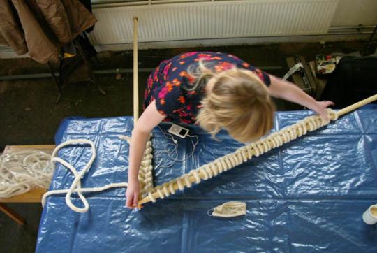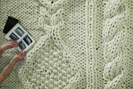 Aran Rug is handknit, using enormous custom made knitting needles, from the wool of 18 merino sheep.