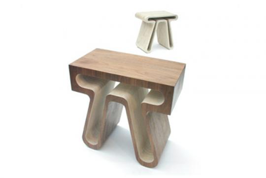 A side table with a nesting stool within. Made from laminated cross-sections of baltic birch plywood with the outer surface wrapped in veneer.