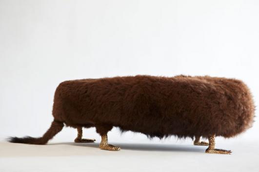 Unique Beast bench with Wyoming Buffalo fur and cast bronze Chester Cheetah feet. Designed and made by The Haas Brothers, Los Angeles, CA, 2013.