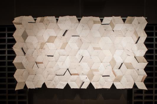 Rucker’s design ethos is rooted in the use and reuse of simple and humble material. His principal medium, OSB, an engineered wood product made from fast-growing trees, is usually used for flooring, walls, ceilings and other construction purposes. OSB is a composite sheet material like plywood, but with less structural integrity.