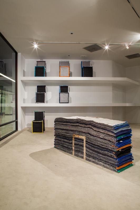 His design aesthetic weds the asceticism of Donald Judd with the rule-based principles of Sol LeWitt, to yield what Rucker calls “a rectilinear vocabulary.” (Rucker also cites Louise Bourgeois, Richard Serra and Matthew Barney as influences). In 2007, he began making cushions and quilts from packing blankets. His construction process utilizes plywood box construction, which involves dados, miter joints and working with a table saw.