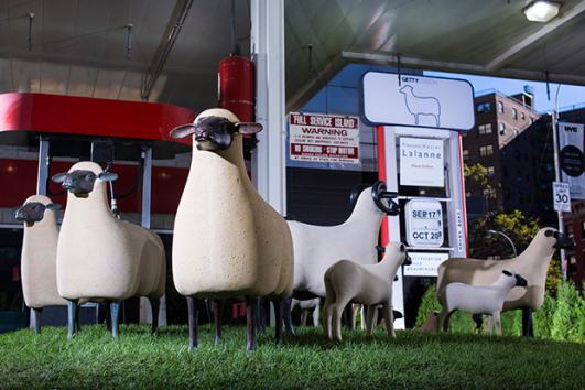 Claude Lalanne photographed in September with a herd of sheep designed by her late husband François-Xavier. photograph by Mathias Braschler & Monika Fischer. © Courtesy the Artists and Paul Kasmin Gallery.