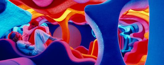 This room discarded all traditional notions of architecture: the floors, walls, ceilings, and furniture seemed to be created from a single cast. The windowless space lacked any connection to the outside world and presented itself as an organic landscape, characterised by dynamic curved shapes that seemed as though they were cut out of the material itself. The elements in various shades of blue and red were like a multiplication of his famous Living Towers placed after one another: the blue shades on the outside, the red shades increasingly becoming brighter on the inside, so that the psychedelic arrangement appeared to glow from within. While the designs of Panton’s contemporaries often evoked associations with outer space, Panton’s livable sculpture with its warm colors and soft textiles sought to bring the interior life of the human being to an outer form.