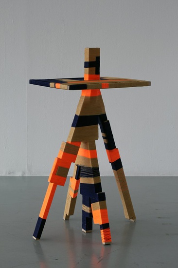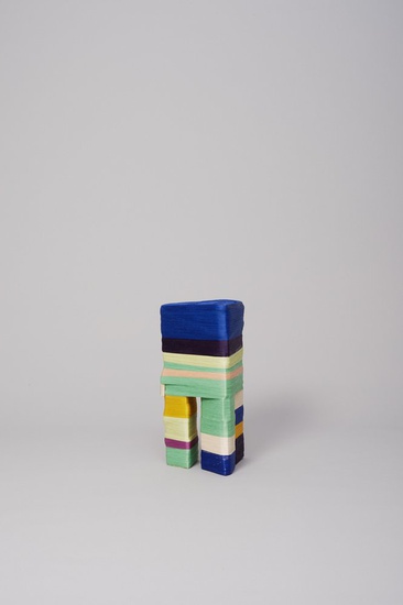 Alvarez's work focuses on the design of systems and the creation of tools and processes for producing products. The Thread Wrapping Machine creates objects by binding components in thousands of metres of thread while coating them in glue. Pieces of material such as wood, steel or plastic are passed through the machine as it spins round, controlled by a foot pedal. As the object is moved through the machine and wrapped in thread, additional components can be added to create chair legs, seat backs and other elements. Varying the colour and type of thread used creates different patterns around the final objects.