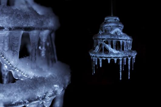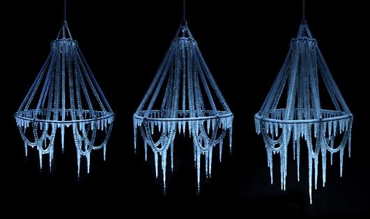 This ephemeral work of nature exudes a timeless boreal light.This faraway, atmospheric light reinterprets a crystal baroque chandelier. It sees water, frost and ice as functional materials, and enhances each of their aesthetic, ecological and structural qualities. This project considers factors of climate as potential drivers that can interact with manmade objects.