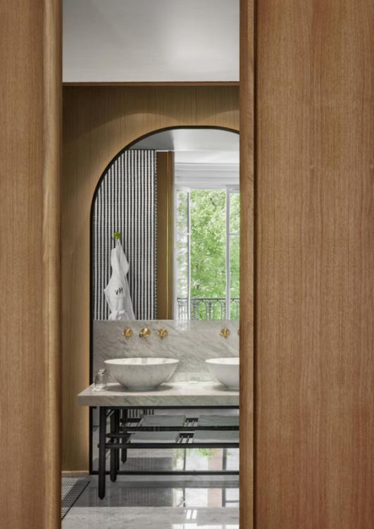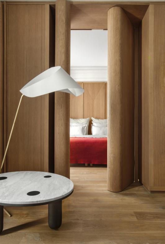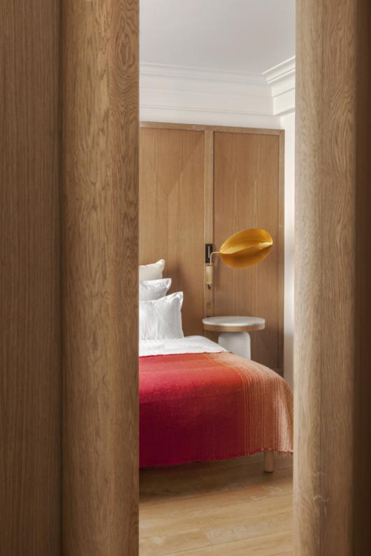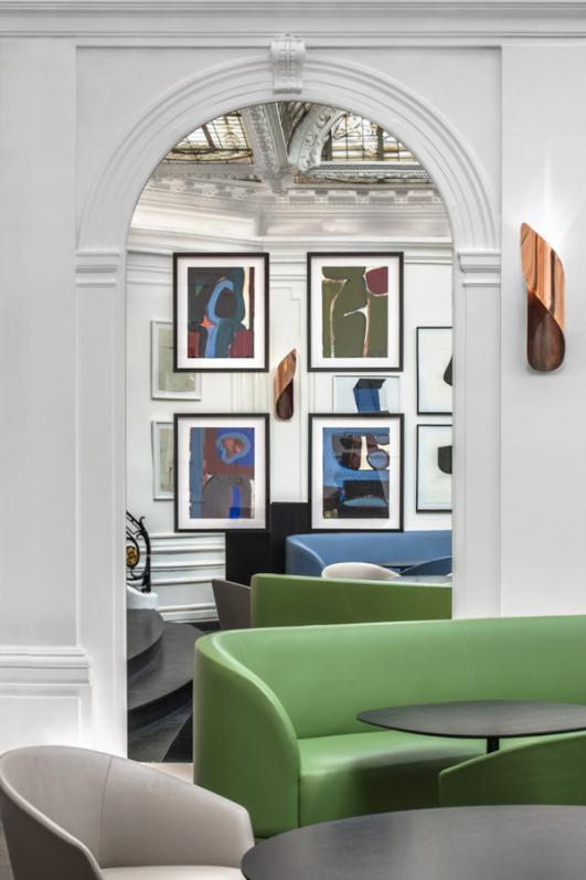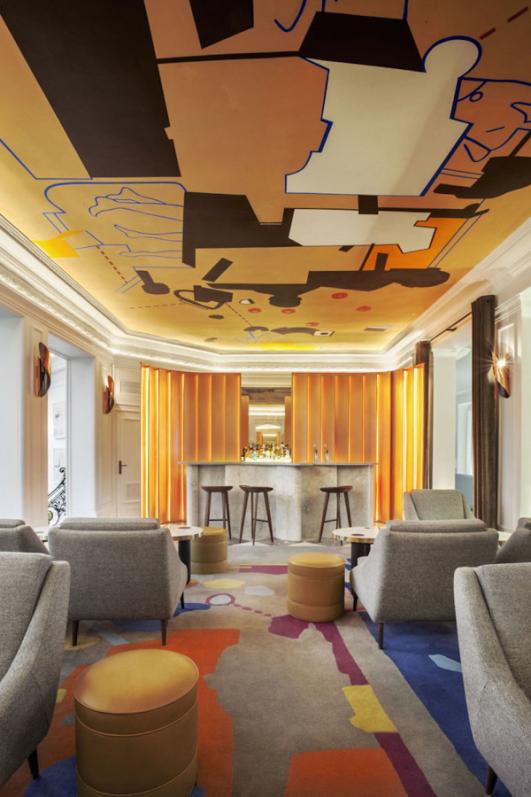 While he kept the iconic stained glass dome in the main dining room, he created thoughtful vignettes of color and shape in every nook of the hotel, using abstract carpets, copper screens and fixtures, ringed chandeliers by Eric Schmitt, a curved bar in the same Carrara marble used on the floor, and a fresco by Jean-Michel Alberola on the ceiling. The artistry extends even to the rooms, outside of which the room numbers sit like sculptures on spotlit pedestals.