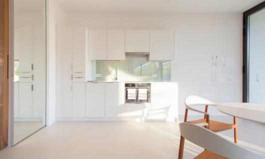 The house opens east with a pristine glass facade reflecting the spectacular view of the Dolomites mountains and making the house almost invisible by reflecting back the landscape.