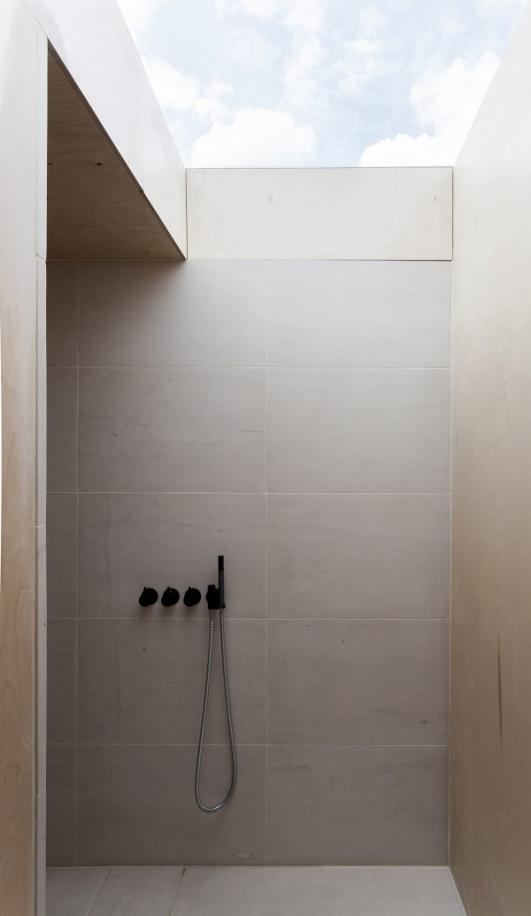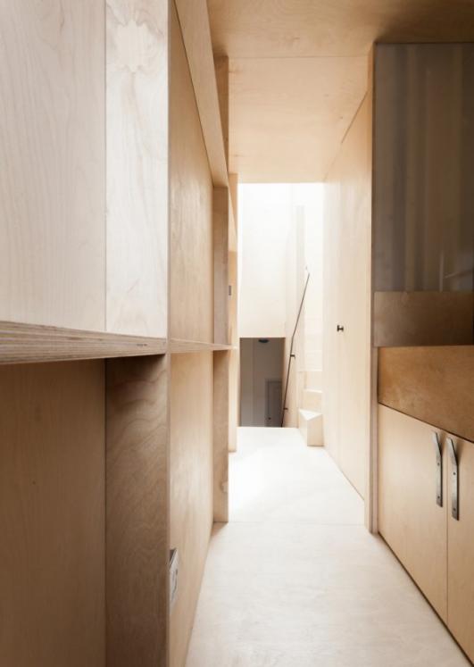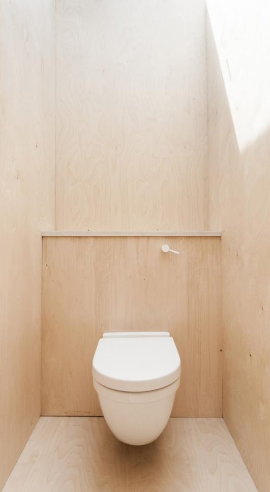 The second floor master suite has all walls, floors and ceilings finished with birch faced plywood. The family kitchen is cast concrete internally and externally with birch faced plywood kitchen and ceilings.