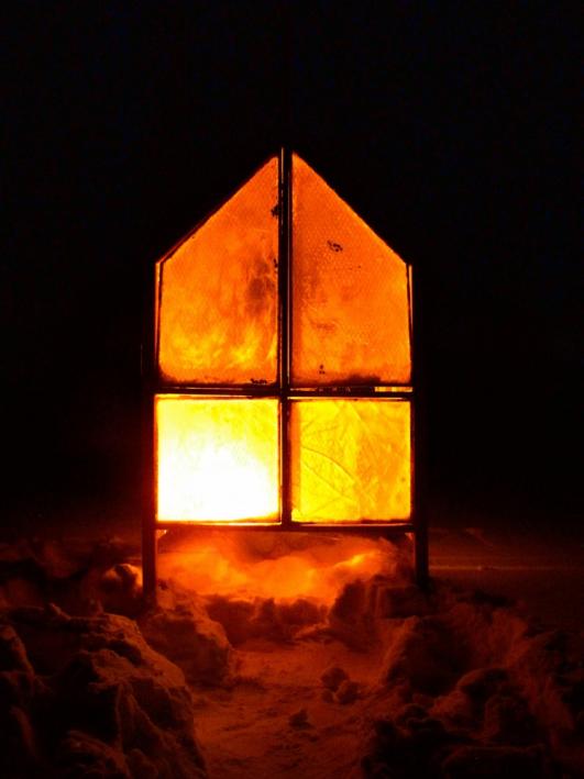The walls are filled with panels of ice made with water from the lake beneath you, cast in snow. The ice panels function as a first skin against the harsh winter winds, creating a pocket of heated air and tranquility, as the cold light of the setting sun is diffused through the frozen water. Lit inside with a candle, the shelter will light up like a lantern.