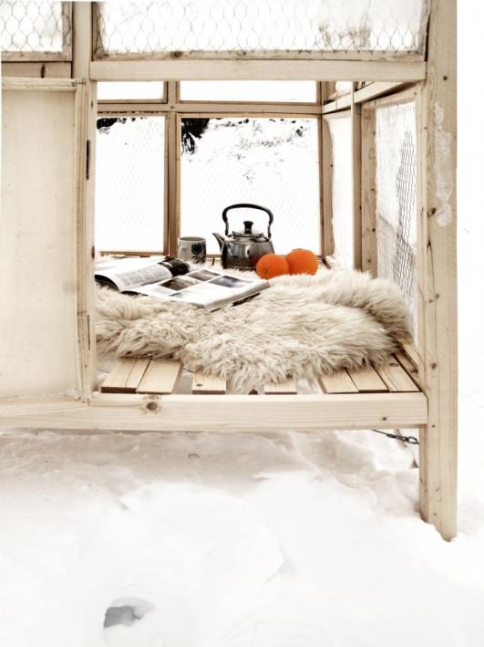 When the weather gets warmer the bare chicken wire walls will serve as support for climbing plants, and form a green transportable gazebo providing fresh cool air for its occupant. Edible climbers like sweet peas, tomatoes and cucumbers will thrive and add to your evening salad.