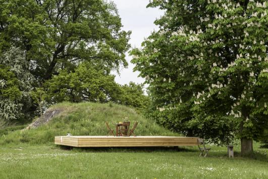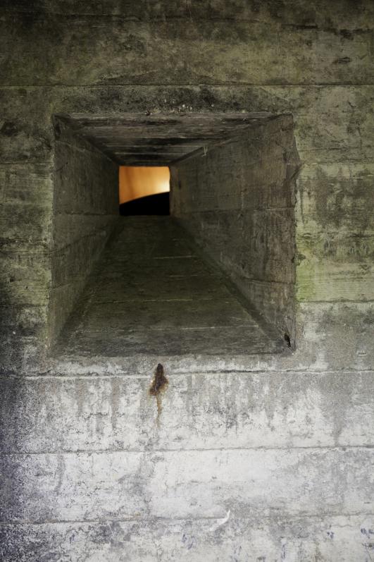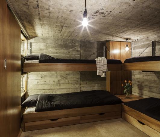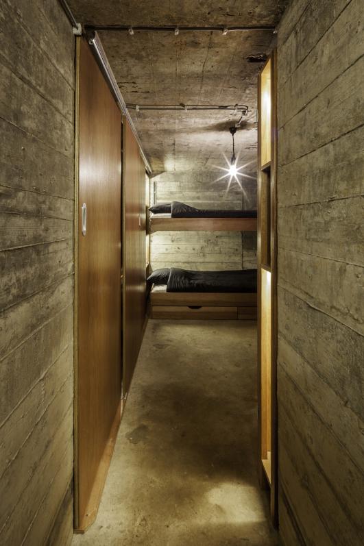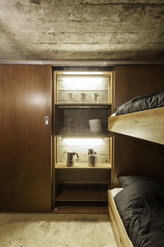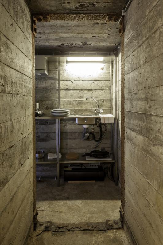 Since the usable surface of the main room measures 3 by 3m with a height of just 1.8m, only the bare essentials for a family holiday could be added. Taking inspiration from ‘Le Cabanon’ by Le Corbusier, flexible wooden furnishing was conceived to maximize the potential of the interior space. The main room functions as a living room as well as a bedroom. All furniture can fold or slide away or be pushed up and down, therefore all objects have a double function. The limited surface of the bunker was extended with an outdoor deck that can accommodate activities such as cooking, sitting, sunbathing and storage. The perimeter of the deck is an exact copy of the outer circumference of the bunker making all the more obvious how much area is lost in the thickness of the monolithic concrete walls.