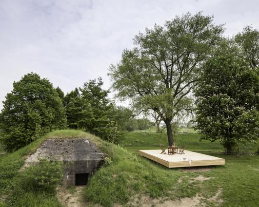 Architectural practice B-ILD turned an old war bunker into a holiday home for two families originally as a publicity campaign - though due to its success it was decided to keep the bunker permanently open for accommodation. The half-buried bunker lies on the site of the Fort Vuren in the Netherlands.