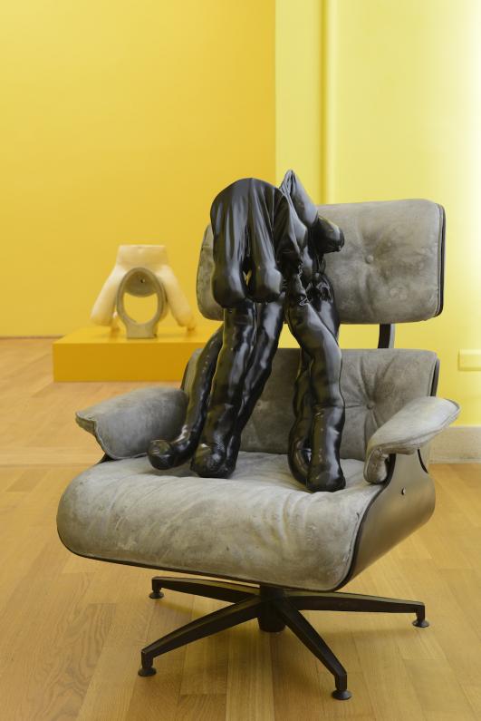 Maradona, a grandiose figure in joyous repose – part man, part maypole, part praying mantis – stands in duplicate at the centre of the exhibition. Named after the iconic Argentine footballer, the figure squats on the ground while an enormous phallus soars majestically into the air. Its arched torso and gravity-defying erection are caught between earthbound and transcendent postures – treading a delicate line between beauty and buffoonery. The sculptures’ painted yellow surfaces (deep cream and gold cup) capture the organic texture of their bulbous stuffed nylon prototype. Combining corporeal resonances with sinuous ‘abstract’ form, Lucas’s new works evoke – and subtly subvert – the Modernist aesthetic of British artists such as Henry Moore and Barbara Hepworth, especially the recurring trope of the reclining nude or lone standing figure. The female body features more literally in a series of plaster sculptures of fragmentary pairs of legs which are gracefully animated through their combination with the ordinary domestic furniture that has featured since Lucas’s earliest installations. These bawdy, empowered muses form a chorus line that upends the traditional objectification of the female form in male art history, while recalling the incomplete bodily casts Lucas has created throughout her career, such as You Know What (1998) or CNUT (2004).