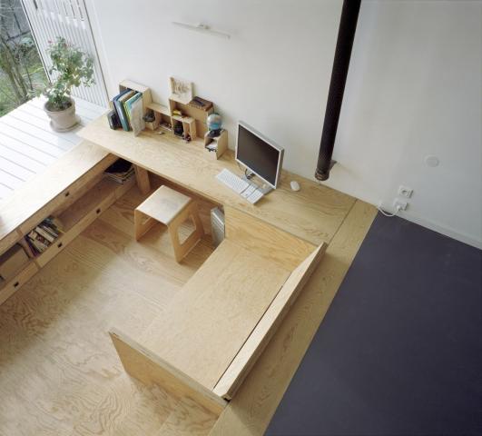 The extension, built on two levels, can be accessed from the second floor of the existing house. Three steps lead from this landing to the lower level of the extension where the study (including a day-bed) is. Three more steps lead to the bedroom on the upper level of the extension. Finally the last three steps lead to the attic which was renovated and whose floor was lowered during the alterations. The layout of the suspended cabin is thus spiral-shaped with the most private areas at its top.