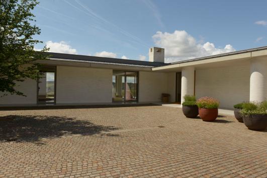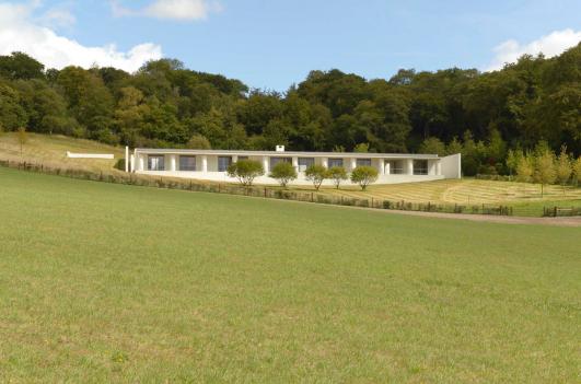 Located on a lush hillside site in Buckinghamshire, the 888-square-meter, single-story home is organized by a loggia that spans the length of the house and connects the living spaces and interior courtyards to the surrounding landscape.