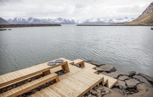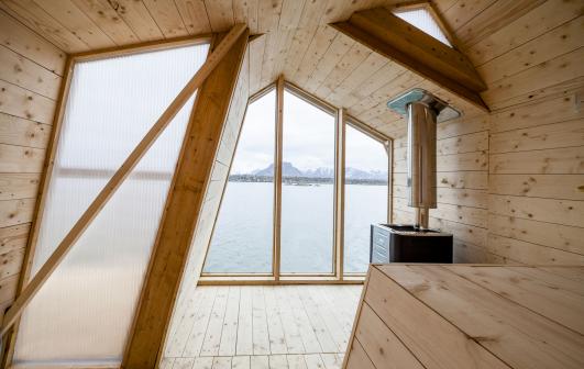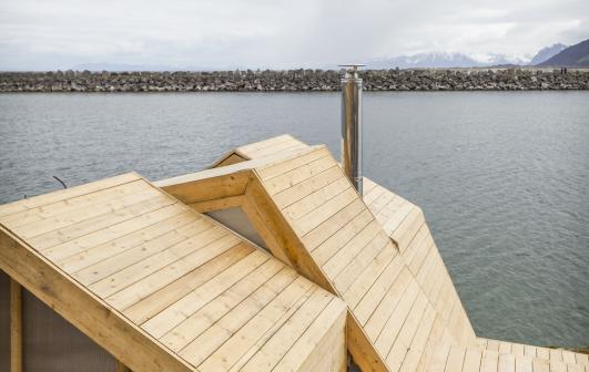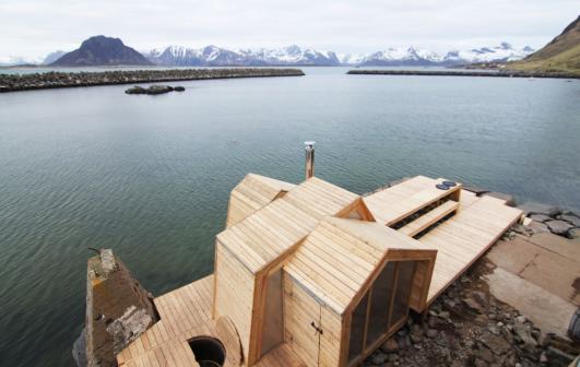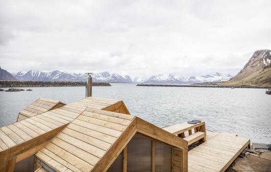 In a former fishing village on the Lofoten islands in Norway, a sauna is built at the end of a quay aiming for a sensitive relation with the landscape and a direct contact with the water. A flexible system of three folding bands which move independently creates the sauna and several outdoor facilities.