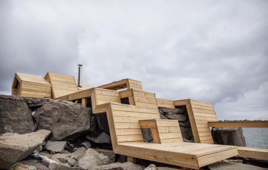 All the facilities are contained in a folding system of three bands. The program consists of four separated areas. In the north side, the bands emerge from the rocks and lead to a hot/cold tub and rest area. The sauna is created by the rising of the three bands that move independently, creating shifts and offsets that allow the light to come inside and generate the different spaces within it. The completely open front facade offers an exceptional view of landscape. Once the bands has wrapped the sauna, the lateral ones go down and advance close to the ground to generate the main terrace while the central band splits to result in a table and benches with integrated barbecue. In the lowest part of the quay the bands continue creating a fish-cleaning table and steps to connect the different heights. The project is designed and built by students of the Scarcity and Creativity Studio from the Oslo School of Architecture and Design, under the supervision of Christian Hermansen, Solveig Sandness and Marcin Wojcik.