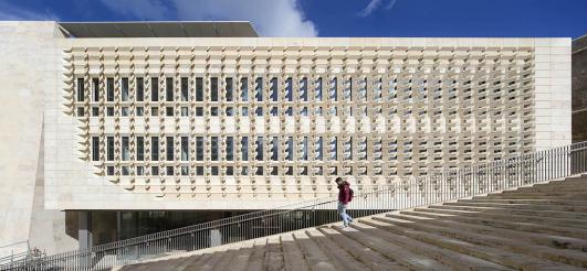 Creating a porous urban block was at the forefront of the building’s volumetric design. The two blocks are separated by a central courtyard, which also serves as the main entrance to the building. The courtyard is conceived in such a way that views through to St James’s Cavalier from Republic Street are not obscured. The new parliament building is detached from the St James’s Cavalier bastion, highlighting the latter’s structure and historic size as part of the city’s fortifications.