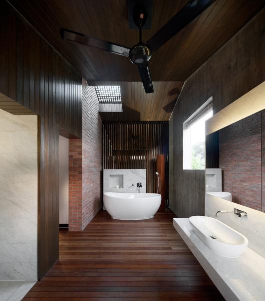 The new enveloping structure is made from board marked off-form reinforced concrete, grafted partially over the preserved brick walls. The board marked texture echoes the existing timber façade. The rustic combination produced an architectonic richness. The concrete structure layers over original parts of the house to create new tactile spaces in the form of a sheltered patio, balconies, and a semi-outdoor shower. Spaces flow from one into another, revealing glimpses of the old and the new, of contrasting materiality. A walk through the house is an endless journey of delightful surprises.