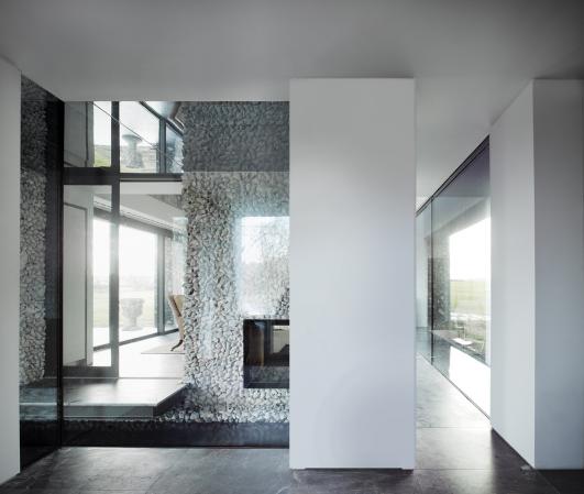 The programme moves from the utilitarian and open spaces at the centre of the site to more contemplative, private rooms buried in the existing trees at the far ends of each building. There are plays with old typologies, techniques and materials; the internal ‘river’ reinvents the historic grotto, but using raw nodules of flint, still covered in chalk, with their ancient underwater origins. It carves a mysterious, internal cave through the structure that separates the public spaces from the more introspective, with views across water, through fire and expanded in reflections. The ceiling of black glass mirrors dark water below, creating an impression of infinite space, drawing the landscape deep into the core of the building, mixing memory and desire.