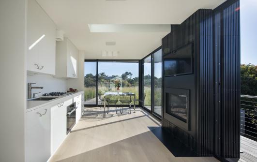 Part of the approval process included a required raised portion of the site dedicated to storm water control and sanitary system. This portion of the engineering requirement was utilized by treating the raised area as the foreground to the architecture. The plinth is landscaped with a native grass that captures the patterns of the wind and references the nearby ocean waves. At the end of the path through the grass, the house is an object in the landscape perched on the edge of the plinth.