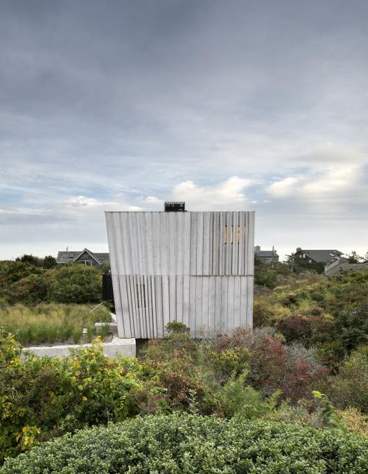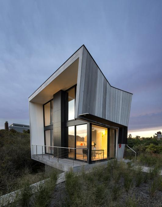 Over 40 years ago, a couple purchased a quarter acre of land located 500 feet from the Atlantic Ocean. The state, county, and town codes evolved and what was purchased as a buildable lot had to undergo extensive negotiations to permit even the smallest house allowed. With a footprint of 15’ x 20’ and a height of two stories, 600 square feet was the largest house that could be built. The governing agencies determined the footprint, but there were conflicting regulations restricting the height. FEMA required the first floor to be elevated 6’ above natural grade, while the town restricted the height of the building to be 25’ above natural grade. With these limited parameters, the strategy was to explore the geometry of the building in section and how it can expand our perception of space.