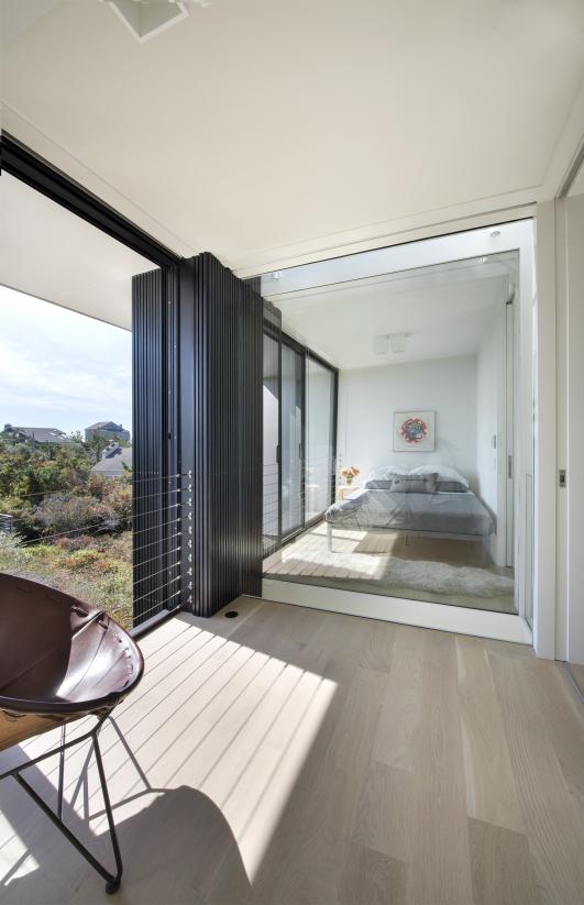Subtle shifts in the geometry of the building section maximize natural light and views to the sky, expanding the perception of space and openness while maintaining the 15’ x 20’ footprint. As the walls splay out from the base of the building toward the roof, the resultant void is a central light well. The bedroom and study are separated by clear glass walls on either side of the light well, but appear to be one large space. The acoustically divided rooms can be made more private by lowering the privacy shades.