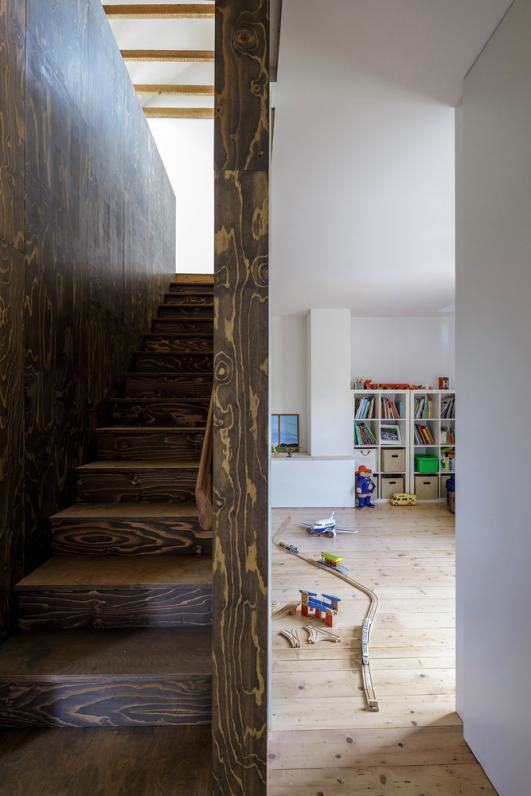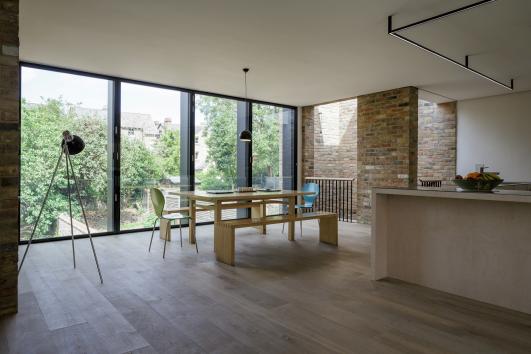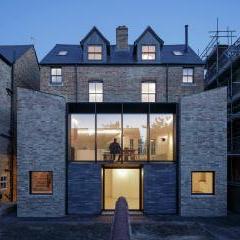 The project involved the conversion of two semi-detached houses in central Oxford into one family home. Two existing Victorian houses are joined together by introducing a new staircase clad in stained timber at the centre of the plan and perpendicular to the party wall.