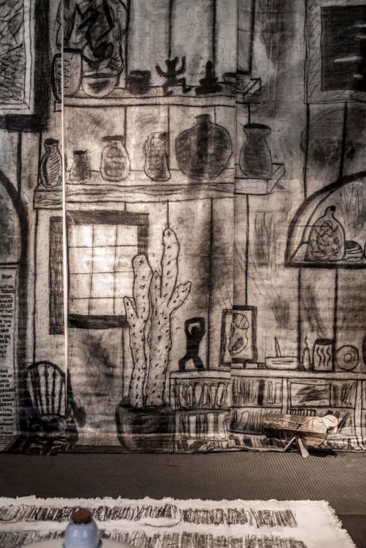 The genteel traditions of the English drawing room have been redrafted by designer Faye Toogood. Visitors to the building are invited to relax in an environment that evokes a derelict country house – although in this case the surrounds have been literally drawn in.