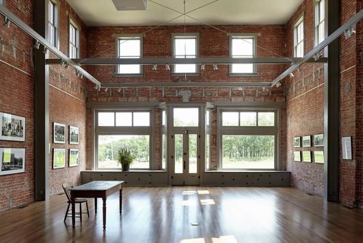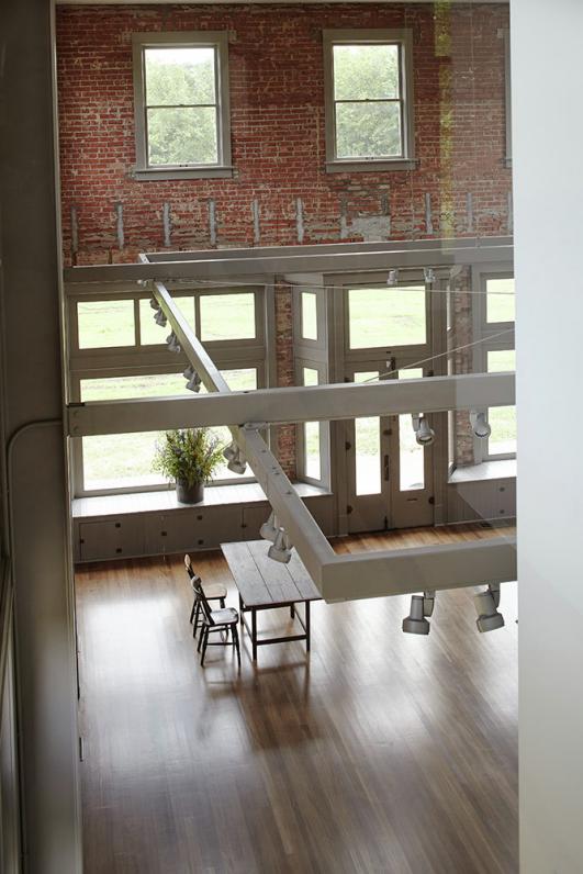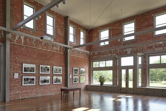 The design team started by taking stock of what was left of the original building. While the roof, second and third floors had collapsed, the masonry shell was left structurally intact and was in good shape. The design team laid out a floor plan similar to the original, with a large open space at the front for events including dining, dancing, and art exhibitions where the main floor of the general store used to be and a catering kitchen and restrooms at the back on the first floor and a second-story single studio apartment where storage used to be. The majority of the second story was not rebuilt, leaving the gallery with an open, flexible and filled with light, revealing two stories of windows and showing off the full height of the original structure.