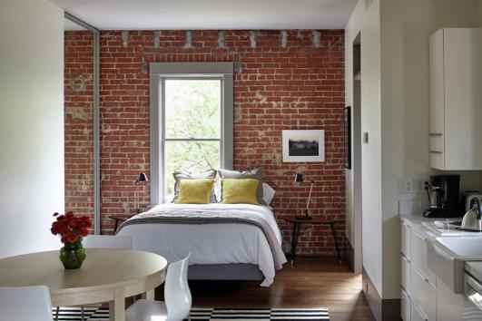 A structural steel brace was installed in the gallery, preventing deflection and supporting the exterior walls. Because the brace was a focal point within the space, el dorado custom designed and fabricated the minimal piece in their shop to control the outcome with super clean details. Lighting for the gallery was integrated into the brace and placement at the where the original first story ceiling would have been provides some scale to prevent the two-story volume from overwhelming artwork on the walls. The living space, a solid block inserted into the void and floating at the back of the building, includes a studio style bedroom with kitchenette and bathroom.
