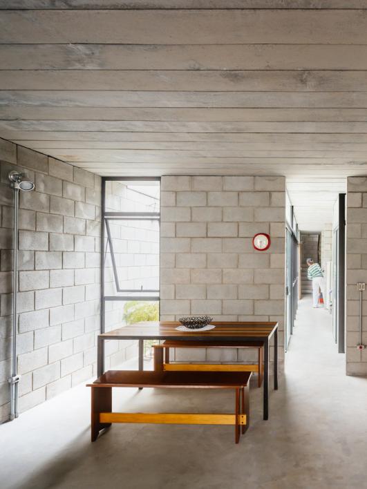 In early 2014, the house showed clear signs of deterioration and began to collapse. Ms. Dalva went on to live on rent at a relative's house. The new house had to be built as fast as possible, else her expenses would completely consume all savings. The architects used our recent experiences in exposed, structural wall blocks to erect a low-cost building, with great control and agility.