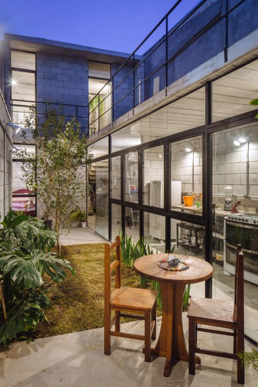 The house is laid out in a 4.8m by 25m urban lot. On the ground floor, it features a living room, lavatory, kitchen, laundry and suite, to attend the needs of the homeowner. An articulation between lavatory, kitchen, laundry and an inner courtyard connects the living room at the front to the bedroom in the back. At the center, the green courtyard provides for light and ventilation. This area also serves as an extensions of the kitchen and laundry. The second floor accommodates a guest room, rendering a total area of 95m2. A vegetable garden grows on top of the living room's concrete slab ceiling, and can be covered later to accommodate future demands of the family.