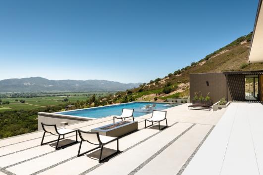 Designed by architect John Maniscalco, Oakville View Estate is a 60-acre luxury property atop the hills in the heart of Oakville, Napa County. The one-of-a-kind home features a sleek modern design aesthetic that blends interior spaces with the outdoors through floor to ceiling glass windows and nearly 3,000 square feet of covered porches and terraces.