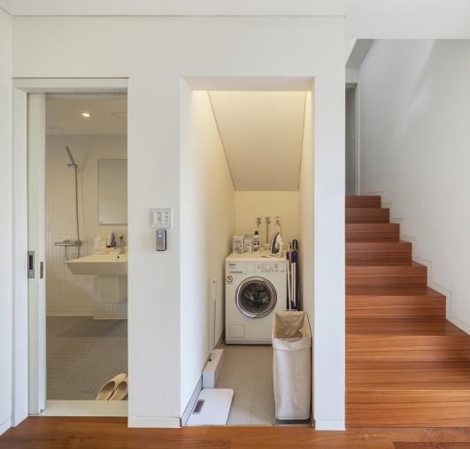 The house is small but every nook and corner of the space is efficiently used. At the attic of the house is a study or a movie screening room, and the stairs that lead to the attic functions as bookshelves. There is a level difference between the living room and the kitchen so that the cooking table is extended to a seated dining table in the living room.