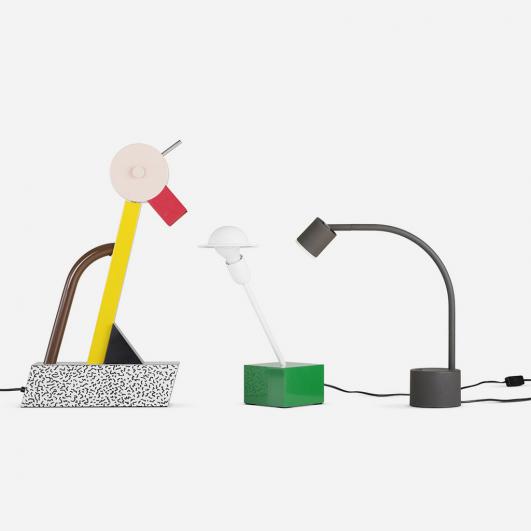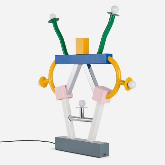 Sottsass’s most famous works are his furniture designs for the Memphis group, which created a sensation and ushered in the postmodern aesthetic of the 1980s. The shrill colours, patterns and forms of Memphis objects were inspired by motifs from everyday life, Pop culture and the non-European civilisations encountered by Sottsass during his extensive travels from the 1960s onward. This resulted in iconic objects like the Carlton bookcase (1981), the lamps Ashoka (1981) and Tahiti (1981), and the Tartar table (1985) – expressive objects that sought to communicate with the viewer and liberate themselves from a functionalist design approach.