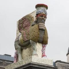 The Invisible Enemy Should Not Exist is a project that Rakowitz started in 2006. It attempts to recreate more than 7,000 objects looted from the Iraq Museum in 2003 or destroyed at archaeological sites across the country in the aftermath of the war. For the Fourth Plinth Rakowitz has recreated the Lamassu, a winged bull and protective deity that stood at the entrance to Nergal Gate of Nineveh (near modern day Mosul) from c 700 B.C, until it was destroyed by ISIS in 2015. It will be the 12th work to appear on the Fourth Plinth since the commissioning programme began in 1998, and will be on the plinth until March 2020.