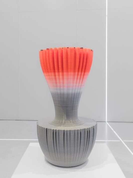 Bow and Rise are the latest results of the extensive, ongoing research that Zaha Hadid Architects is conducting within the domains of 3D printing and material experimentation. These chairs combine pristine design informed by structural optimisation processes typically found in nature, with innovative materials and the most advanced fabrication methods. The pattern and the colour gradient of both pieces concur in redefining the traditional spatial relationship between furniture and its setting. Bow and Rise have been printed with a pellet-extruder employing raw plastic particles rather than a filament. The chosen plastic is PLA, a non-toxic, biodegradable material from renewable sources such as corn-starch, which ensure lightness and stability.
