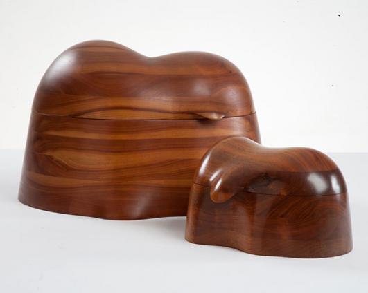Unique jewelry boxes in stack-laminated walnut. Designed and made by Wendell Castle, Rochester, New York, 1973 and 1975. Signed and dated "WC 73" and "WC 75."