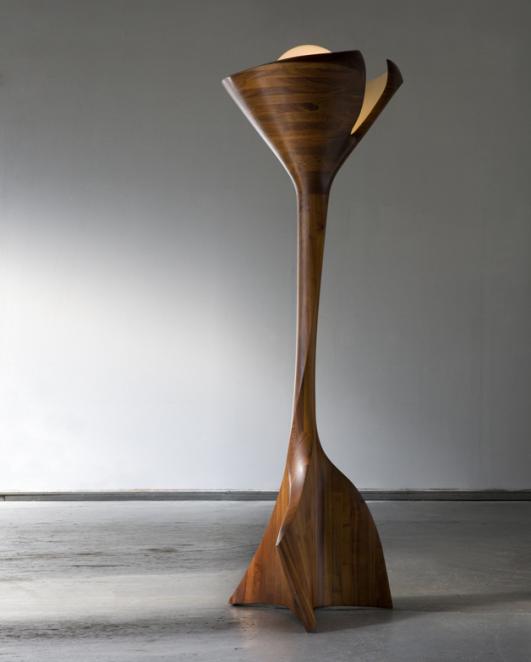 Unique floor lamp in hand-carved and stack-laminated walnut with glass globe. Designed and made by Wendell Castle, Rochester, New York, 1970. Signed and dated, "WC 70."