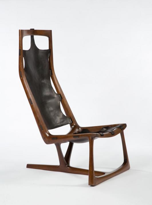 Early "Kangaroo" chair in hand-carved walnut and slung leather. Designed and made by Wendell Castle, Rochester, New York, 1962. Signed and dated, WC 62. One of the first three chairs produced by Wendell Castle.