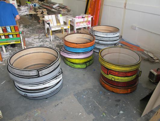 We wanted to use these curled wooden blanks.......normally never seen outside the workshop environment.....in their pre- machined state to remain as they are and serve as raw structures for stacking and printing. 'We stacked the rings, like used tyres from a car breakers yard, and Richard printed his wood grain pattern onto the surface '.