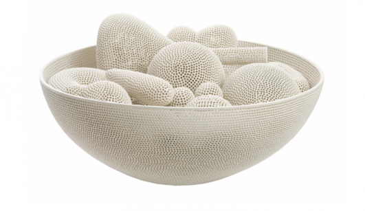 In this new body of vessels, marsh has moved aesthetically between the coolly rational intricately perforated works that are the product of a methodical methodology and what the artist characterises as the less rational aggregate and heavily textured works that appear to be the result of natural process.