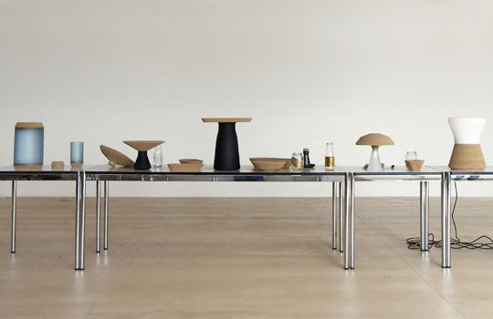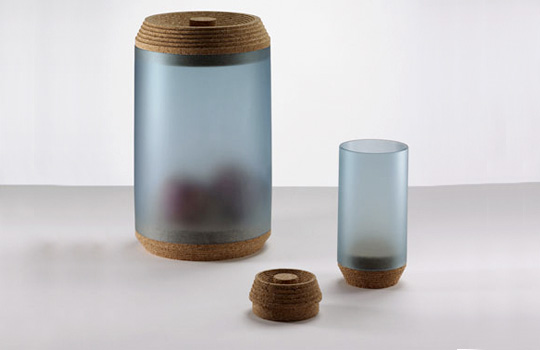 Exploring possible connections between glass as a hard and compact material and cork, a perfect porous material, Kral devised a series of objects ranging from lamps, bowls, side tables and containers. Each glass segment was created using free glass blowing, while the sections in cork were made from sheets of agglomerated cork which were then milled using a CNC machine, incorporating the marks from the tooling into their overall aesthetic.