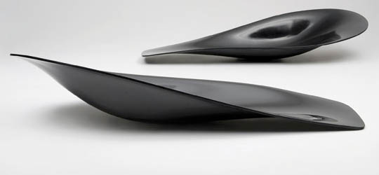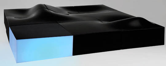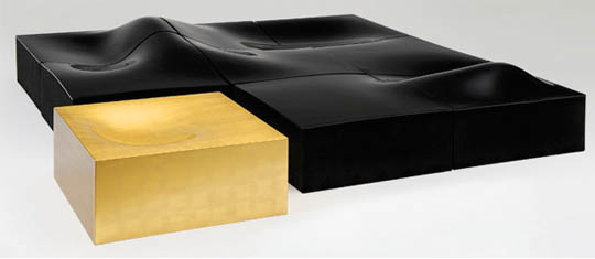 The exhibition features a series of pieces using black corian. The designer stages “life platforms”: matrixes of nine elements showing a setting including an oil spill, revealed by a moonlight, expressed with a poetic inner sense.